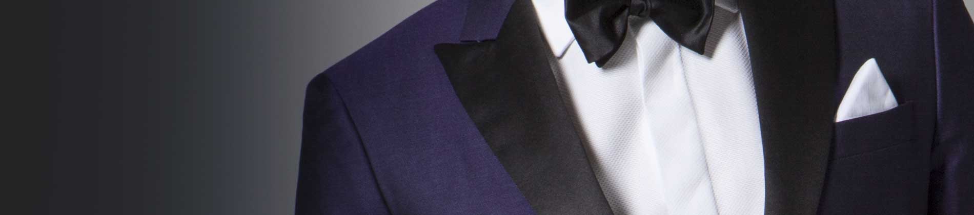 Single breasted peak lapel dinner suit in black or midnight blue, no vents, no pocket flaps. Black to-tie bow tie.