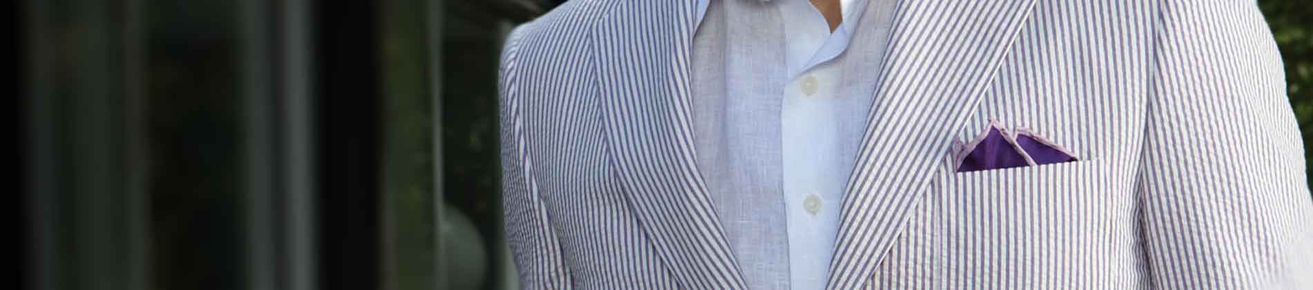 SEERSUCKER A summer suiting staple featuring the characteristic ‘crinkle’ stripes woven in the vertical (warp) direction. ‘Seersucker’ is a phonetic variation on the Persian term ‘shirushakar’ meaning ‘milk and sugar’. Ours is a pure cotton quality in a variety of traditional and contemporary colors.