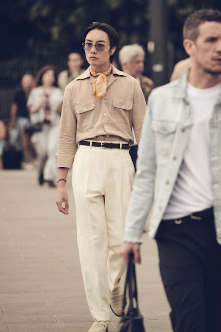 Lemons not only served as the theme of Pitti Uomo 106 but the citrus fruit hues seemed to filter through to its stylish guests too. Every conceivable shade was spotted, whether it was full on muted yellow pinstriped suits, US Marine tees, egg yolk shorts with black linen guayaberas, a rayon sash on a beige panama, a silk bra worn beneath an oversized suit, a bandana sat beneath the Cuban collar of a beige seersucker shirt or even a yellow parasol providing shade from the Florentine sun.