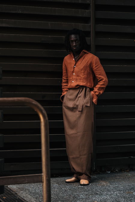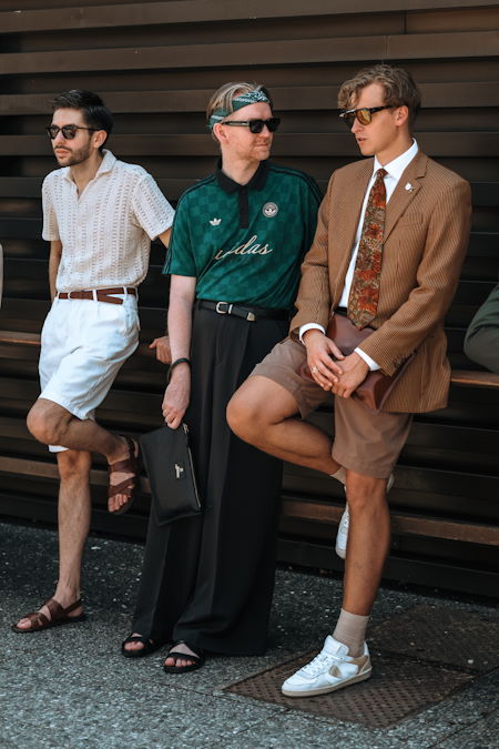 While there were odd pops of burgundy and sky blue, the colour we’re told not to wear in urban surrounds, brown, remained as strong as ever, often combined with cyan, orange or cream accents - whether it was jackets worn with roomy linen shirts or ribbed vests under airflow-inducing knitted cardigans.