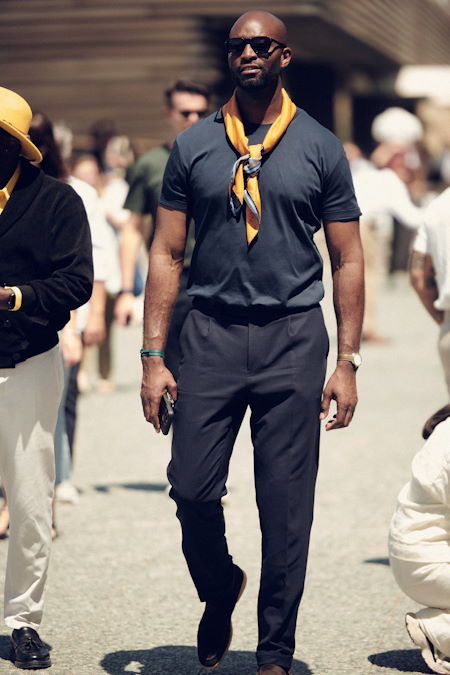 Where a navy jacket was the canvas for bolder, more playful and unexpected sartorial details such as a vivid rep-stripe shantung tie or madras pattern were noted - or stylishly draped pleated slacks in lucid pops of yellow or orange.