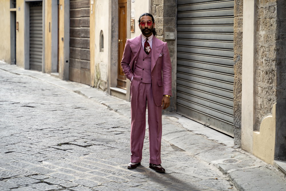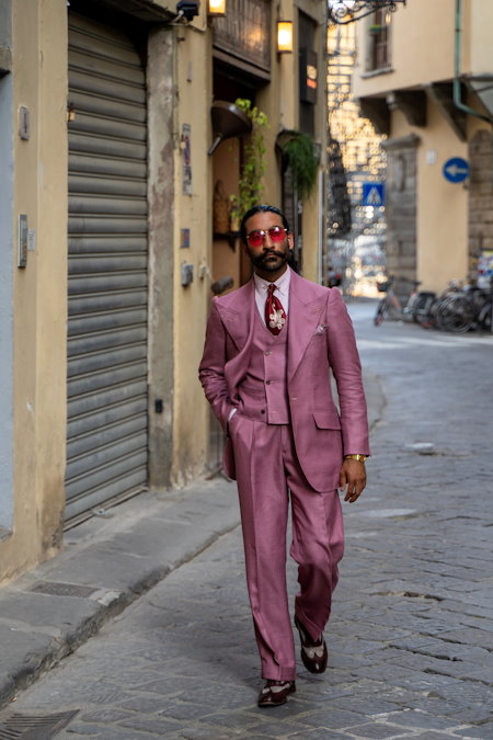 LO: Your pink Pitti suit crafted from HFW cloth was quite theatrical in style. Talk us through your inspirations and how it turned out. I believe it was Tommy Nutter/Edward Sexton?