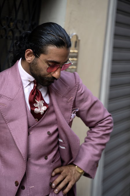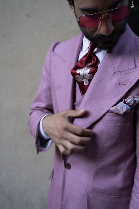 SA: I tried to keep things simple as the suit was already super bold and standout so a monochromatic approach with the shirt and matching vintage 2-tone brogues from Joseph Cheaney ensued. I wanted to include the tinted sunglasses for that hint of 70s summer Miami Vice: a matching pink shade I had custom-made from a local optician using Japanese frames. The tie was a vintage 1940s piece I found on eBay last year. Full silk and I thought the red and pinks would go well together and the texture of the fabric wouldn't bulk up the front. It was shipped from the States and is a piece I really love to wear to give a real vintage feel.