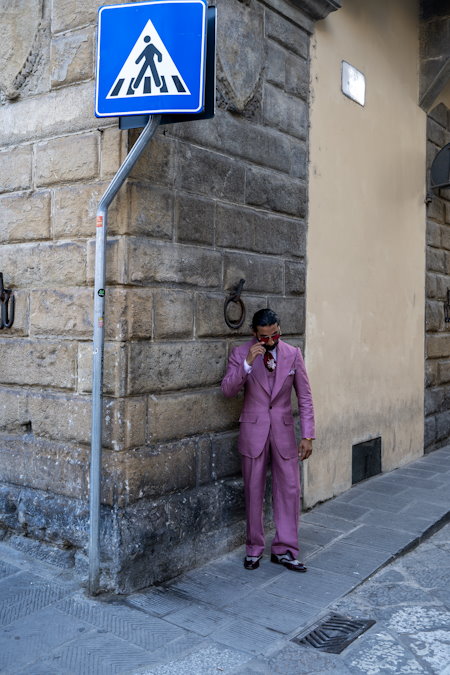 SA: When I got into the groove of menswear circles on social media, I started noticing this phenomenon called Pitti Uomo: a bi-annual tradeshow where all my favourite guys were hanging out. I'd already explored London on my adventures discovering Savile Row tailors, shirtmakers, shoemakers and the like, to explore British craftsmanship and its tailoring heritage, so, I thought Italy would be the next place to conquer. Pitti in Florence, being a mecca for menswear enthusiasts, was then the no-brainer choice to be. It was here after several editions of the show, together with my standout style that I caught the attention of my tailor who wanted to work with me in a collaborative effort as brand ambassador - to show off and represent their work - it was a real dream come true moment. I'd already seen their work online, the most beautiful Neapolitan details under a Japanese twist: two cultures I truly admired for their approach to craftsmanship. I think the style really spoke to me because of the design forward approach Michele takes, everything had a speaking expressive quality from the roped shoulders down to the double-pick stitching. I fell in love.
